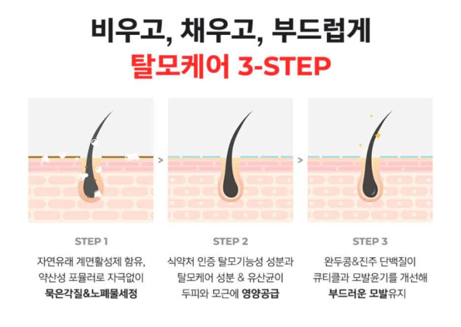 두피에 묵은 노폐물을 씻어내고, 깨끗해진 두피와 모근에 영양을 공급하고, 마지막으로 모발에 단백질을 공급하여 찰랑찰랑한 머릿결까지 3-STEP 단계로 완벽하게 탈모케어를 해주는 샴푸라는 거~! 이 정도는 돼야 진심이 느껴지잖아요. (이러니 절로 엄지척~ ㅡ,.ㅡb)