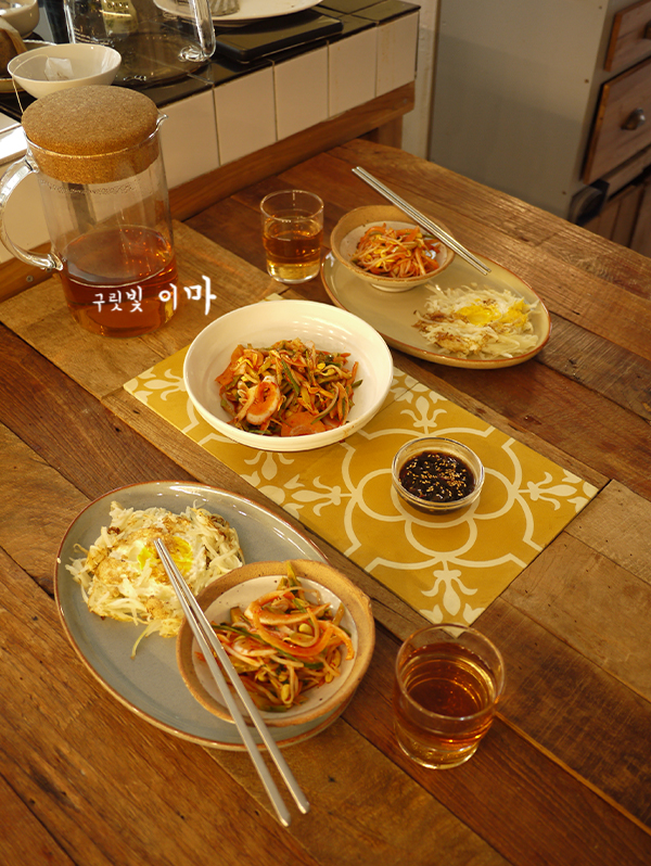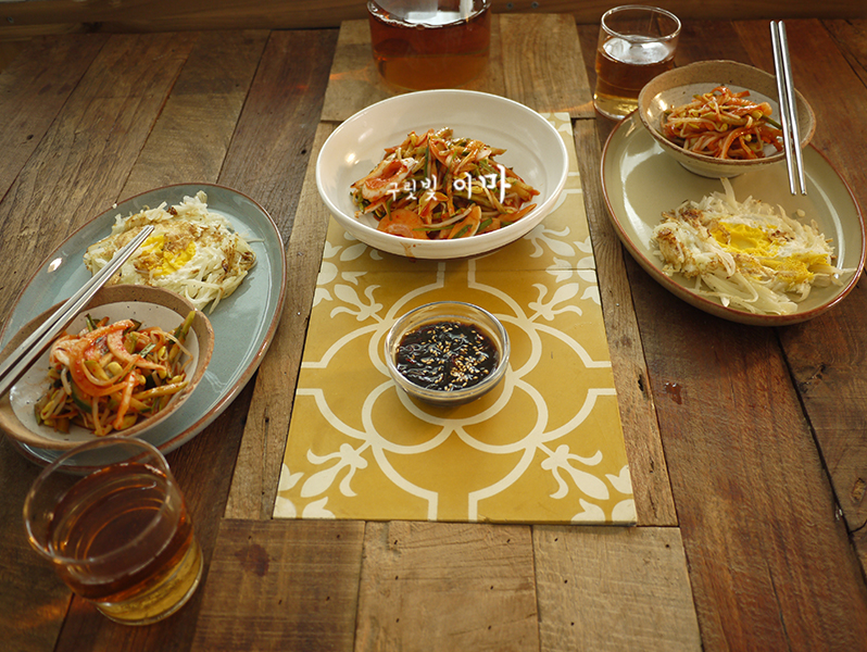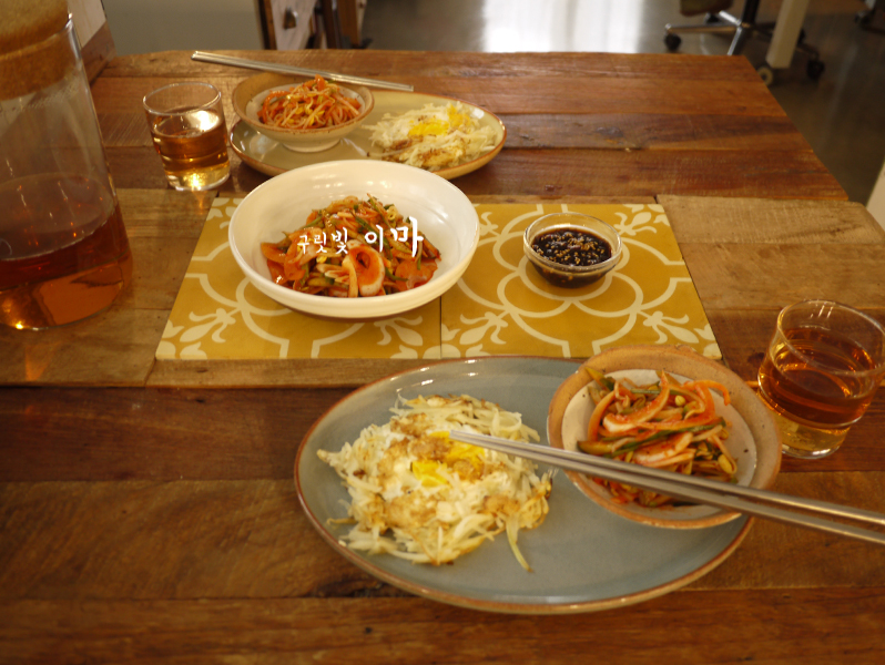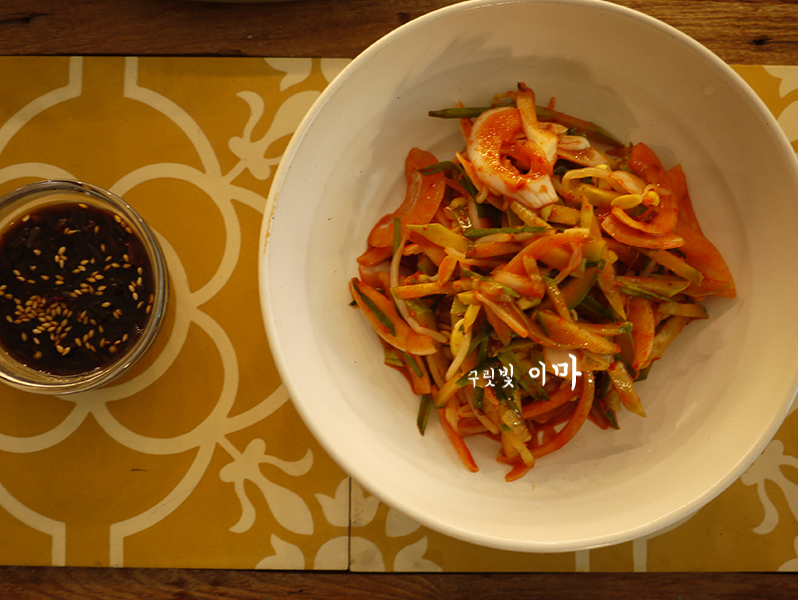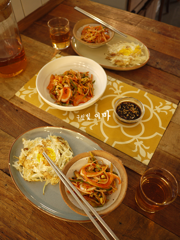 그 위에 매콤한 야채무침을 야무지게 올려서 먹음~