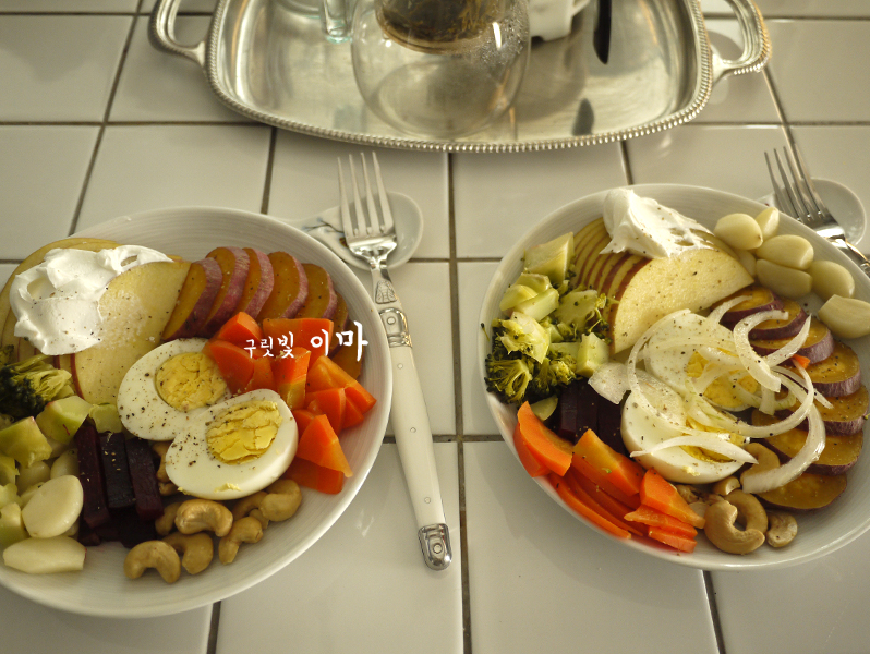 달걀, 마늘, 고구마, 당근, 비트, 브로콜리는 찌고