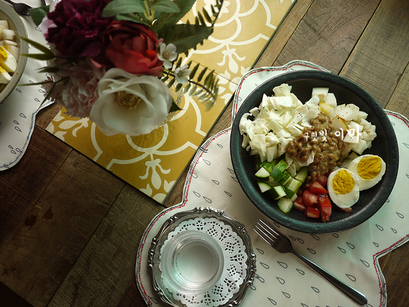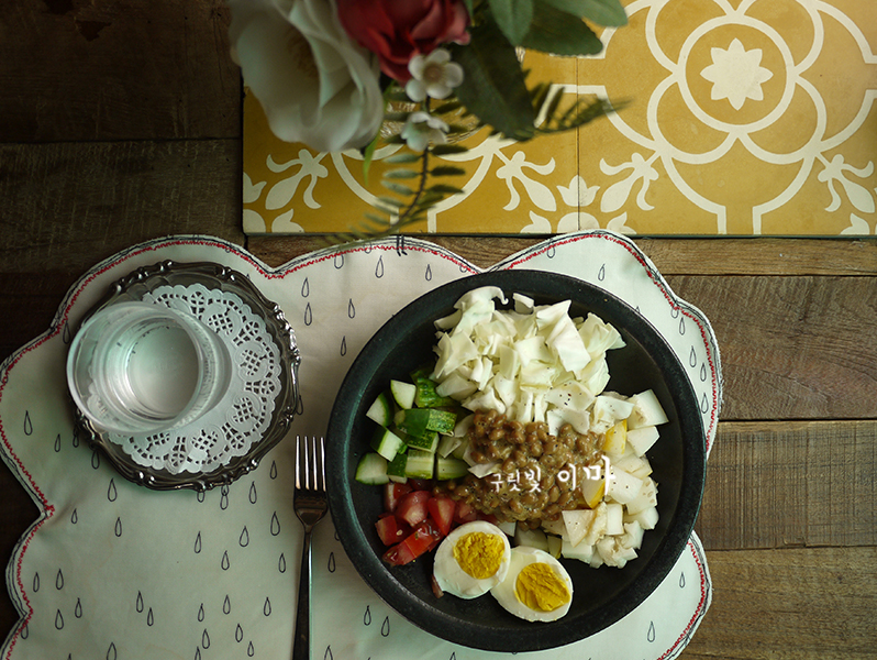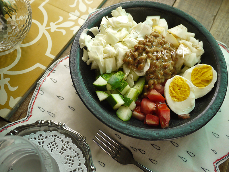 야채 샐러드에 나또를 추가했어요.