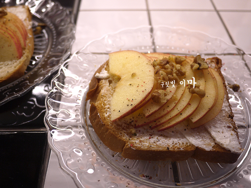 그 위에 아삭아삭 달달한 청송 사과 얇게 썰어 올리고