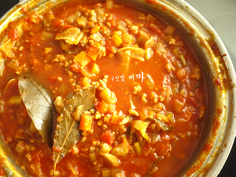 월계수 잎을 넣고 뭉근하게 끓이면 간단하게 라구소스 완성!