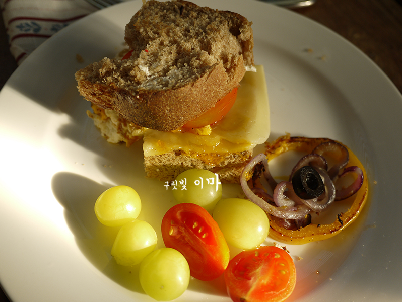 치즈, 구운 야채들, 토마토, 달걀프라이를