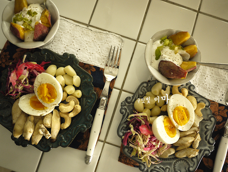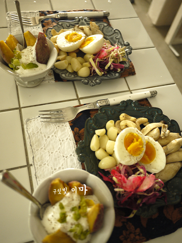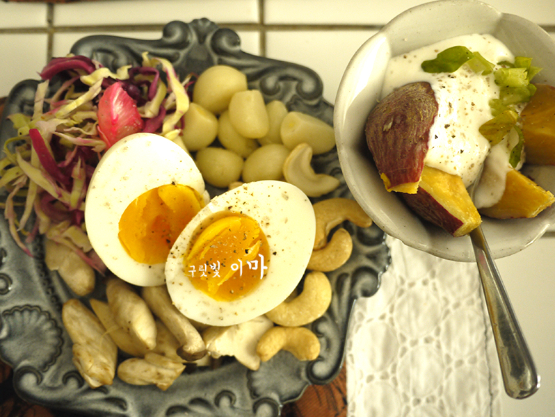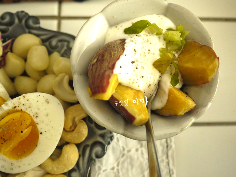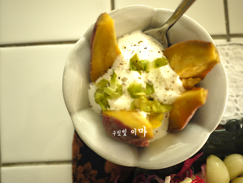 몸에 좋은 후식으로 찐 고구마와 사워크림~